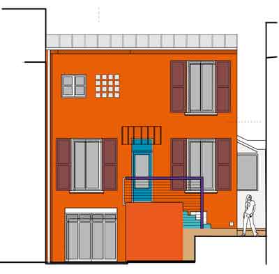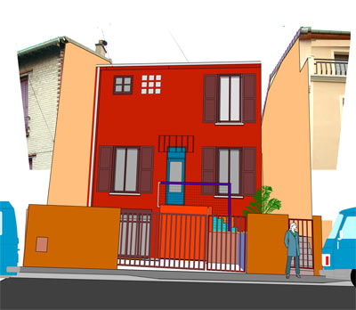 | Deuxième agrandissement d'un pavillon, cette fois ci vers le haut, et création de place de stationnement sur rue. Maçonnerie traditionnelle. | ||||||||