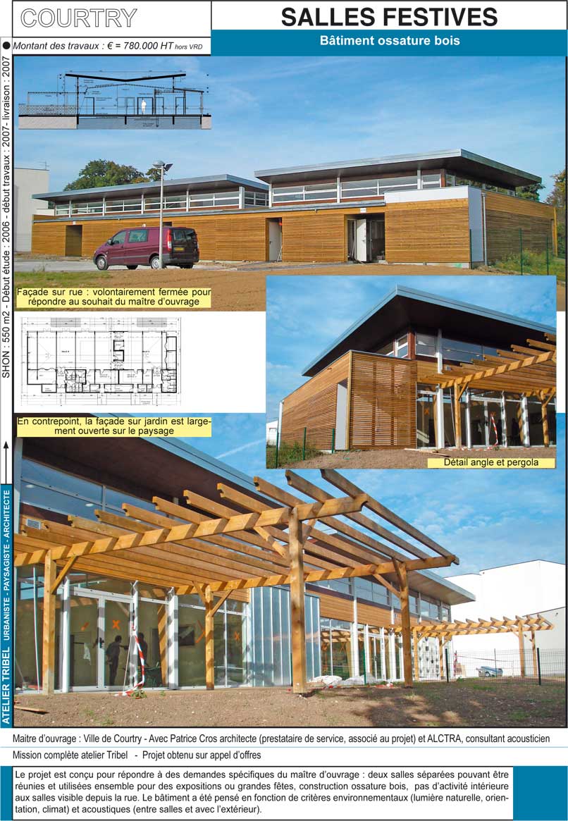 Les salles festives de Courtry sont réalisées en ossature bois. Largement ouvertes sur le jardin et fermées sur la rue (demande Ville), elles sont séparées par les locaux de sonorisation mais peuvent fonctionner ensemble (grande manifestation ou exposition). Entreprise SCB Maulay. |