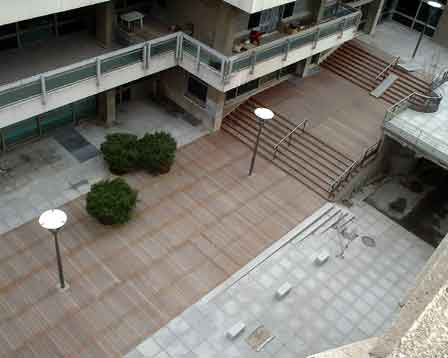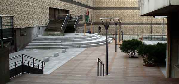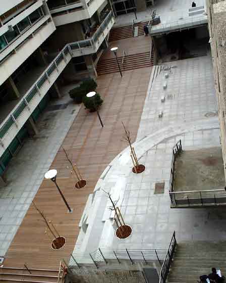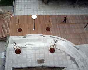Ont été aussi réalisés : les gradins de forme semi-arrondie, en granit massif 60x30 cm, une dalle de couverture de la voie pompiers qui étend la dimension de l'aire piétonne principale ainsi que toutes les serrureries.