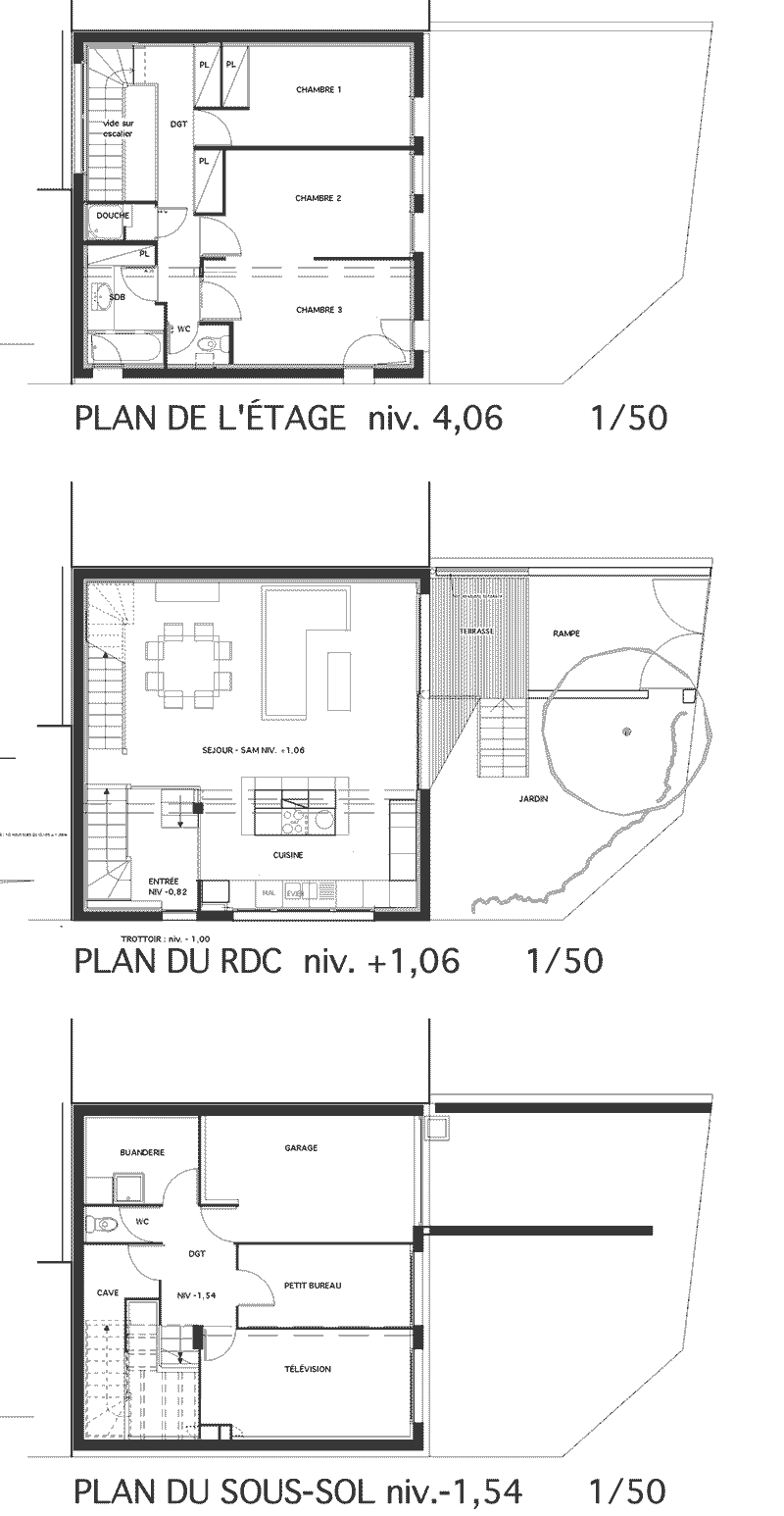Rez-de-Chaussée prolongé par une terrasse en bois, à 1,40m au-dessus du jardin.