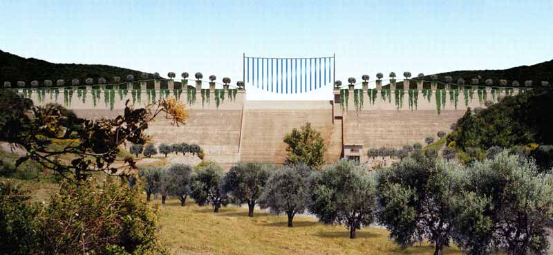 Le site : le barrage des Olivettes, à 30 minutes de Béziers, situé dans des collines de garrigue à proximité de la commune de Vailhan. Le projet : création d'une ligne d'oliviers plantés dans des bacs de hauteur différente, reprenant l'épure générale des collines environnantes. Au-dessus du déversoir, la "porte du vent" est un ensemble de fines bandes textiles animées par le vent. Au pied du barrage, aménagement d'une zone touristique autour du plan d'eau aval. Les perspectives sont réalisées par STEEN. |
