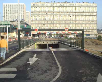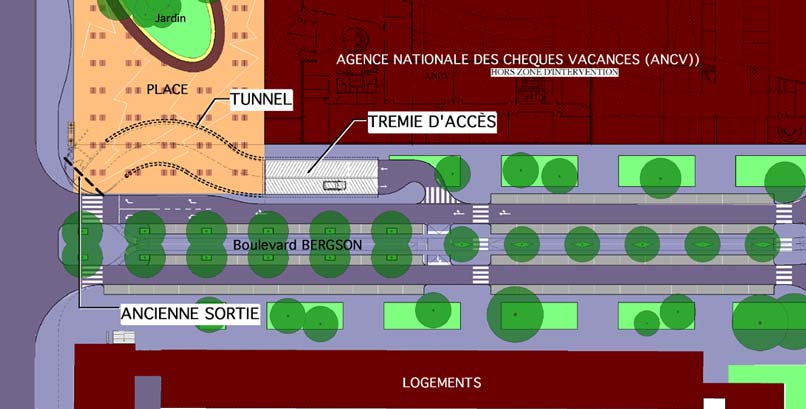 | L'accès Sud au parking des Flanades s'ouvrait à l'emplacement de la future place publique. Aussi, le tunnel a été prolongé de cinquante mètres, la trémie d'accès refaite. L'ensemble de l'opération entre dans le cadre du réaménagement global de l'îlot XI, projet obtenu sur concours, et qui intègre : place publique, boulevard Bergson, mail piétonnier. | |||||||